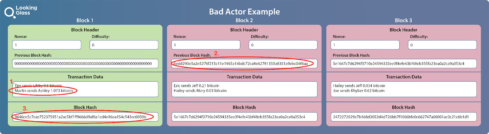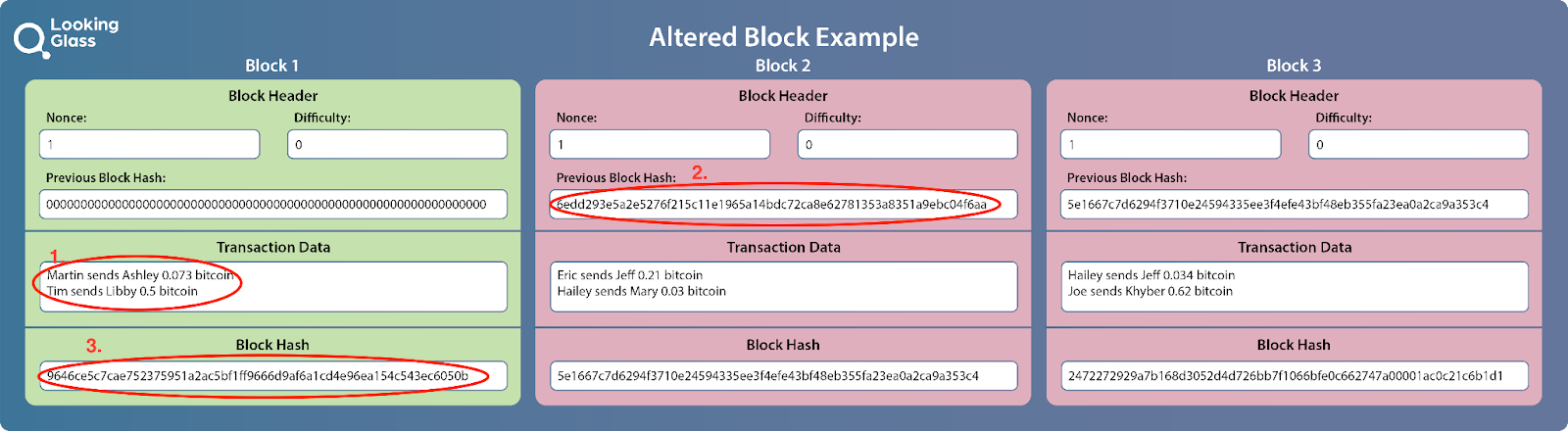 - Be able to break in and change the data on two of the three sets of this blockchain.