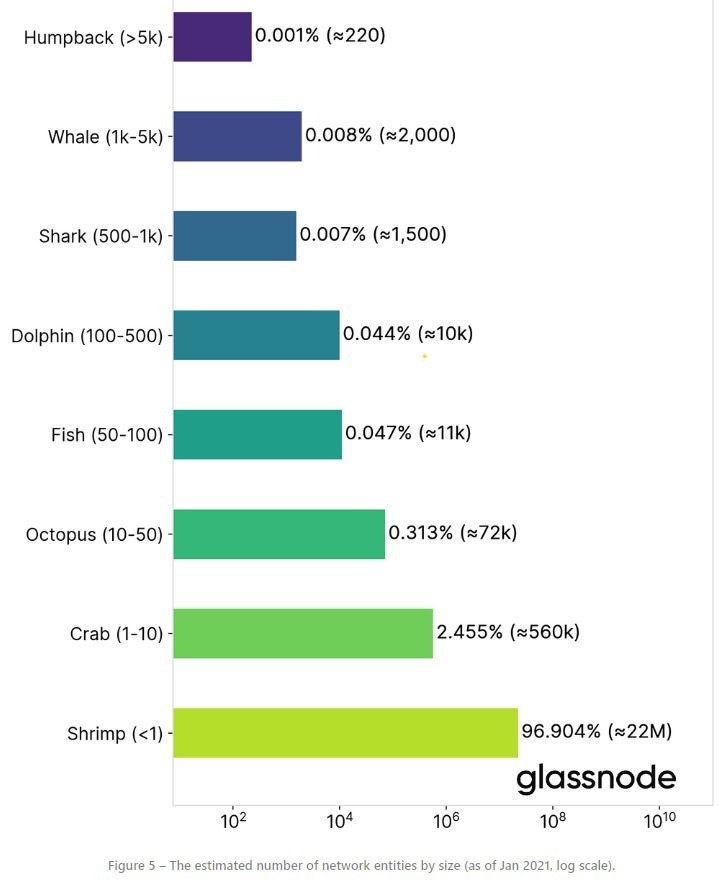 - Figure 2.51 is a chart from January 2021 that details how many addresses are in each cohort of wallet size. For example, there are 22,000,000 Shrimps (Wallets holding less than one bitcoin).